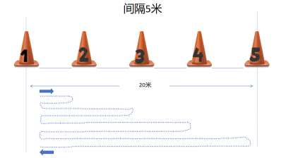 场地器材:场地内设置起始端标志线,起始端设置标志盘5个。距离起始端标志线20米处,设置完成端标志线,中间每间隔4米设置1个标志筒,共设置标志筒5个,按从起始端到完成端的顺序编号为1→2→3→4→5号。