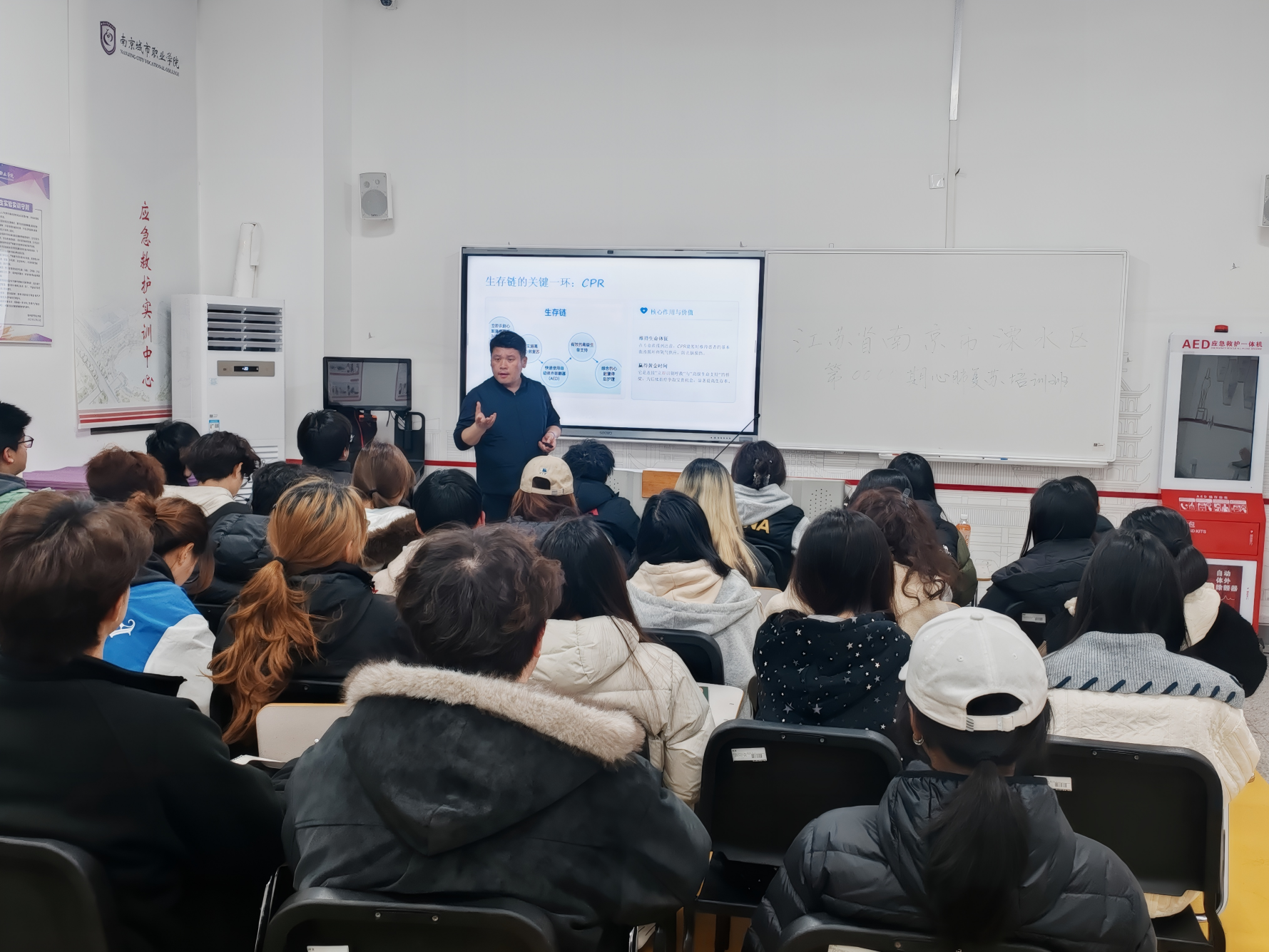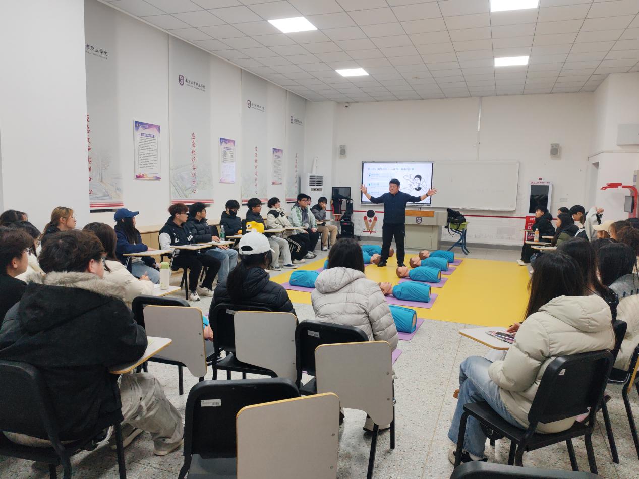 该课程依托新建成的急救护实训室开展,配套专业自动体外除颤器(AED)教学机及全套急救实训设备,采用理实结合、侧重实操的教学方式,以证代考,聚焦心肺复苏(CPR)、AED规范使用、气道异物梗阻处置等核心技能。